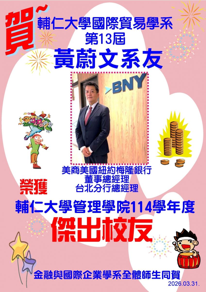 活動訊息 活動花絮 榮耀分享 榮耀分享 首頁 系友專區 榮耀分享 115.03.31.恭喜黃蔚文學長-榮獲輔仁大學管理學院114學年度傑出校友 可喜可賀! 誠摯恭喜國貿系第十三屆黃蔚文學長,榮獲管理學院114學年度傑出校友! Top Back